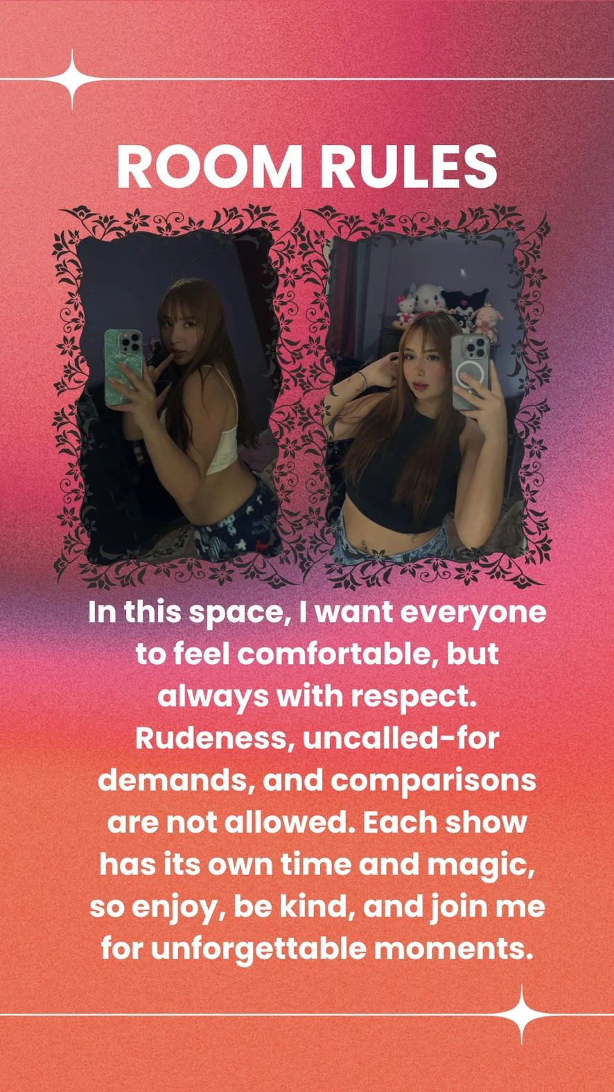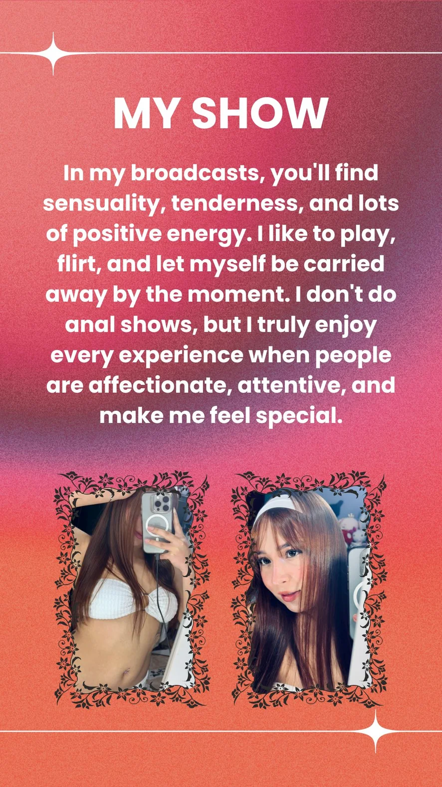 Erotic Dance, Fingering, Dildo or Vibrator, Nylon, Ahegao, Spanking, Camel Toe, Striptease, Foot Fetish, Facial, Deepthroat, Masturbation, Twerk, Orgasm, Oil Show, Squirt, Doggy Style, Cock Rating, Dirty Talk, Humiliation, Jerk-off Instruction, Sex Toys, Tittyfuck, Gagging, Nipple Toys, Role Play